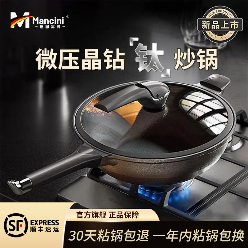 Mancini德国晶钻钛锅无涂层不粘锅家用鲸鱼平底无油烟微压炒锅