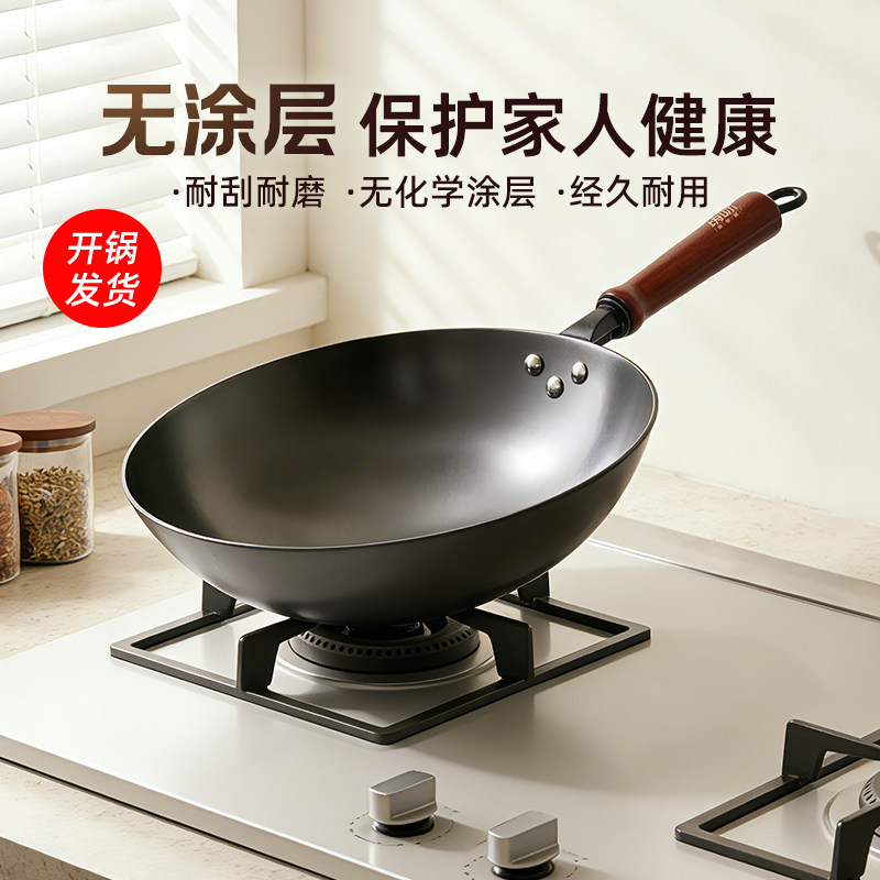 章丘老式纯铁锅不粘锅家用炒锅无涂层炒菜锅手打无油烟燃气灶适用