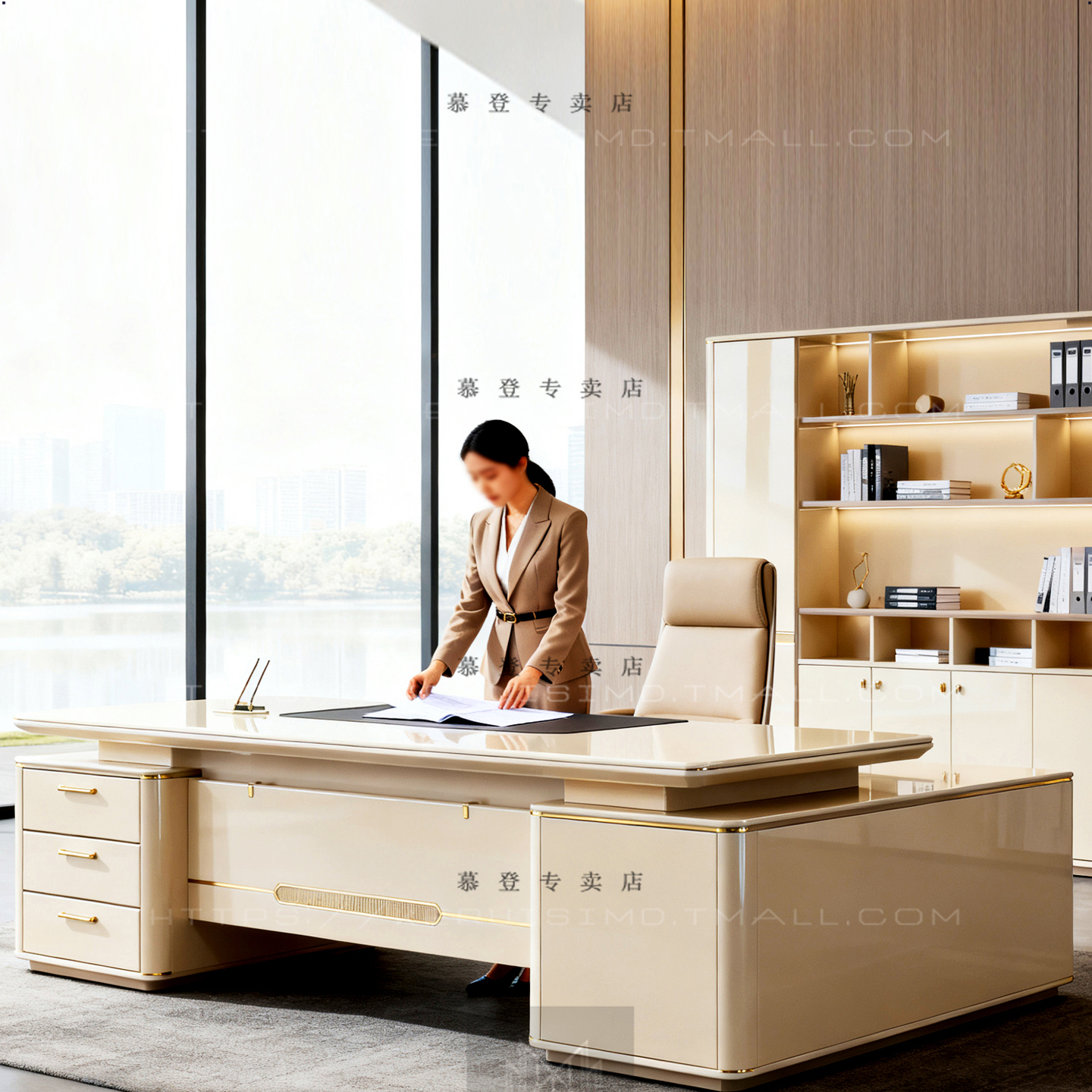 现代轻奢办公桌 女士老板桌 米白色办公桌 亮光烤漆大班台 2米4桌