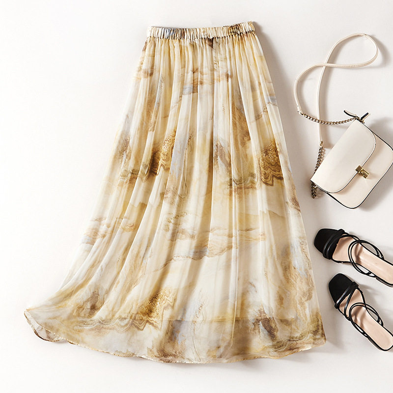 女夏季真丝印花休闲气质半身裙桑蚕丝花色度假海边中长薄款沙滩裙