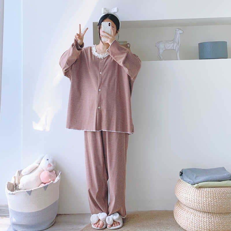 芬腾婴儿棉睡衣女春秋款棉质长袖家居服秋季女款开衫宽松大码套装