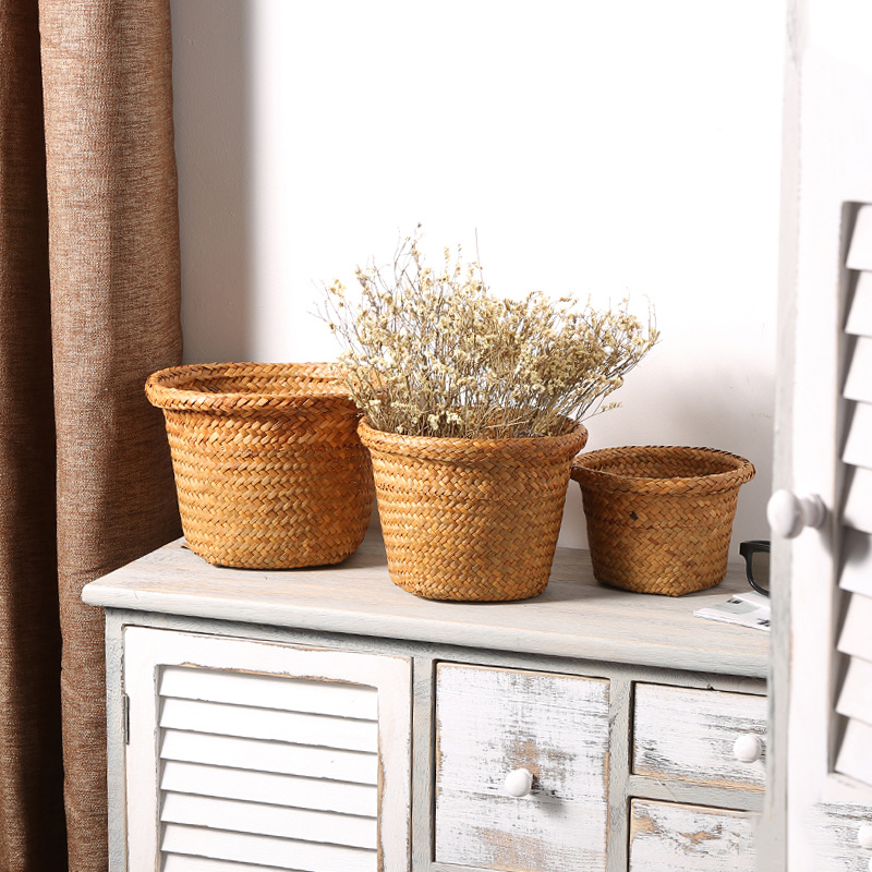 KENS 圆形桌面收纳盒草编 多肉花器花盆套花篮装饰篮 微型废纸篓