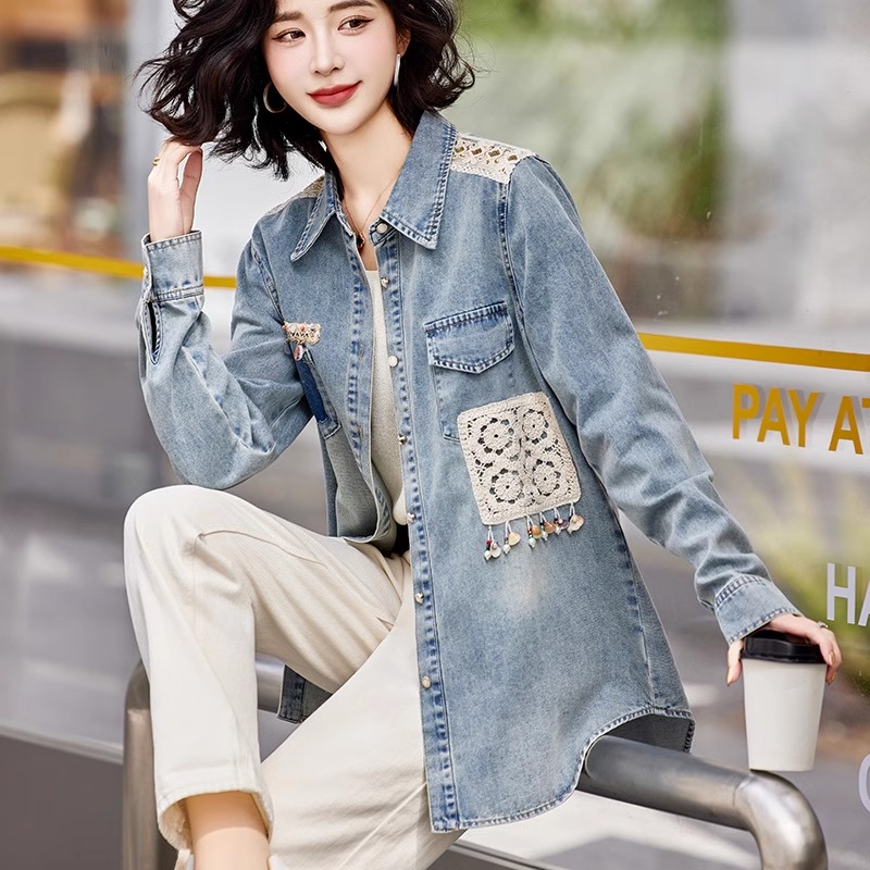 欧货时尚流行蕾丝拼接牛仔衬衫女外套春2025上衣洋气休闲大码女装