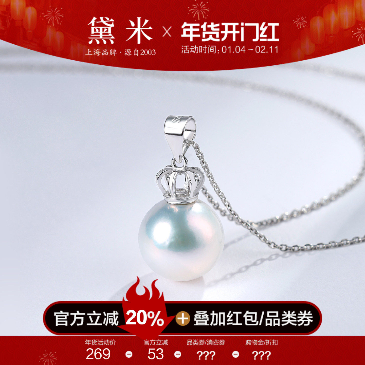 黛米珠宝 颜如霜 9-12mm圆形淡水珍珠项链 S925银王冠单颗大吊坠