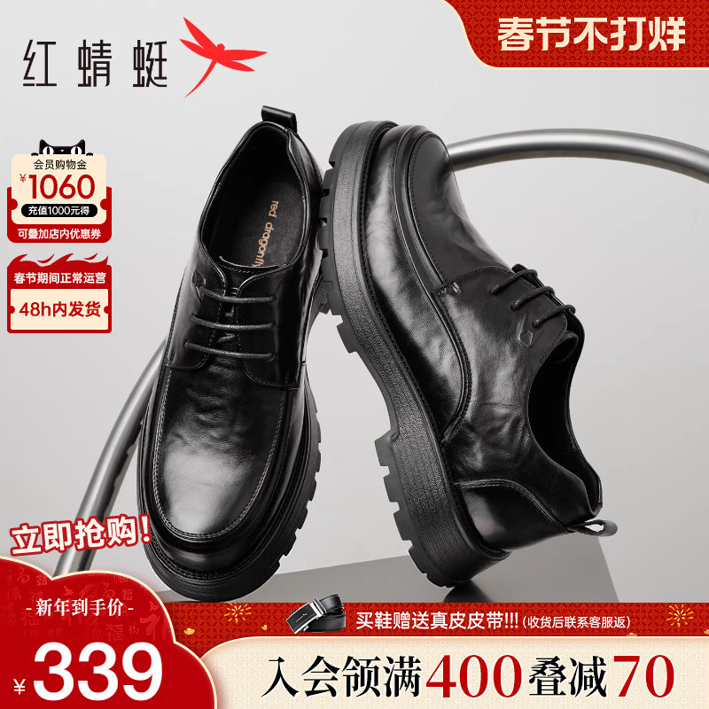 红蜻蜓男鞋秋冬新款商务皮鞋褶皱厚底青年真皮皮鞋男士增高休闲鞋