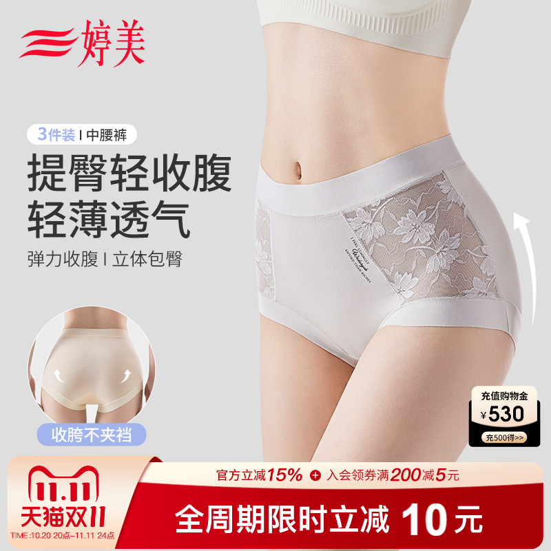 【3条装】婷美高弹中腰提臀内裤修身显瘦轻薄透气隐形无痕三角裤