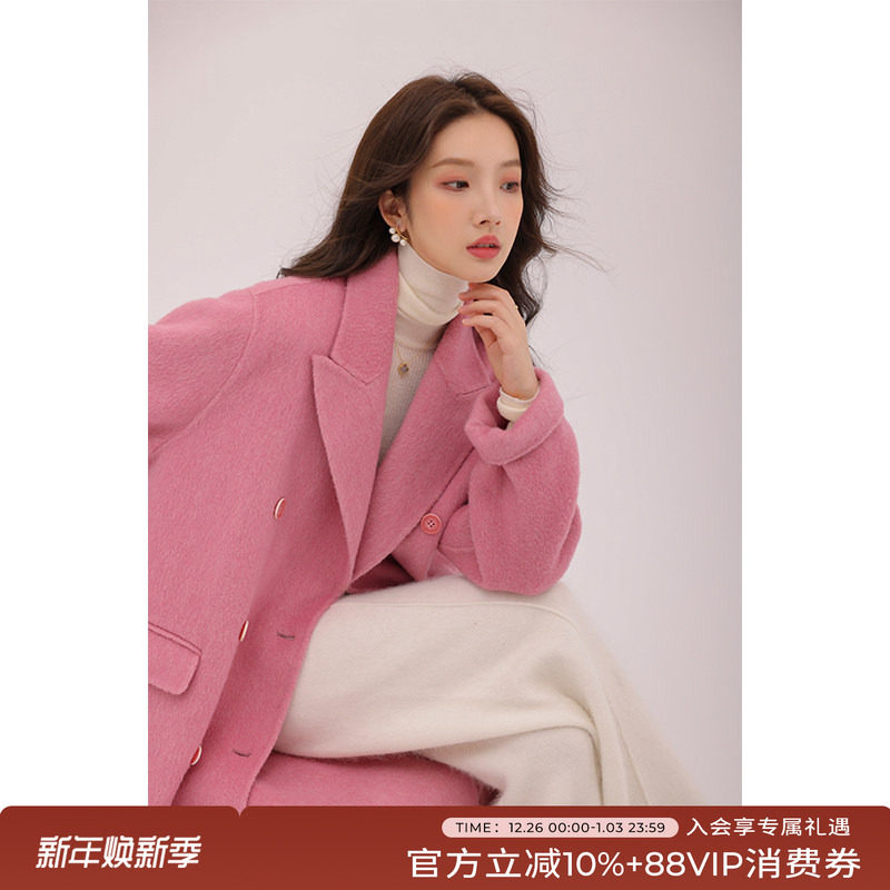 ZHUYIYI 粉红色西装领手工双面羊绒大衣女24秋冬新款气质毛呢大衣
