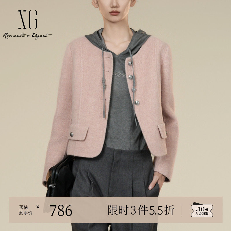 XG雪歌短款长袖加厚毛呢外套2025冬季新款粉红色圆领绵羊毛大衣女