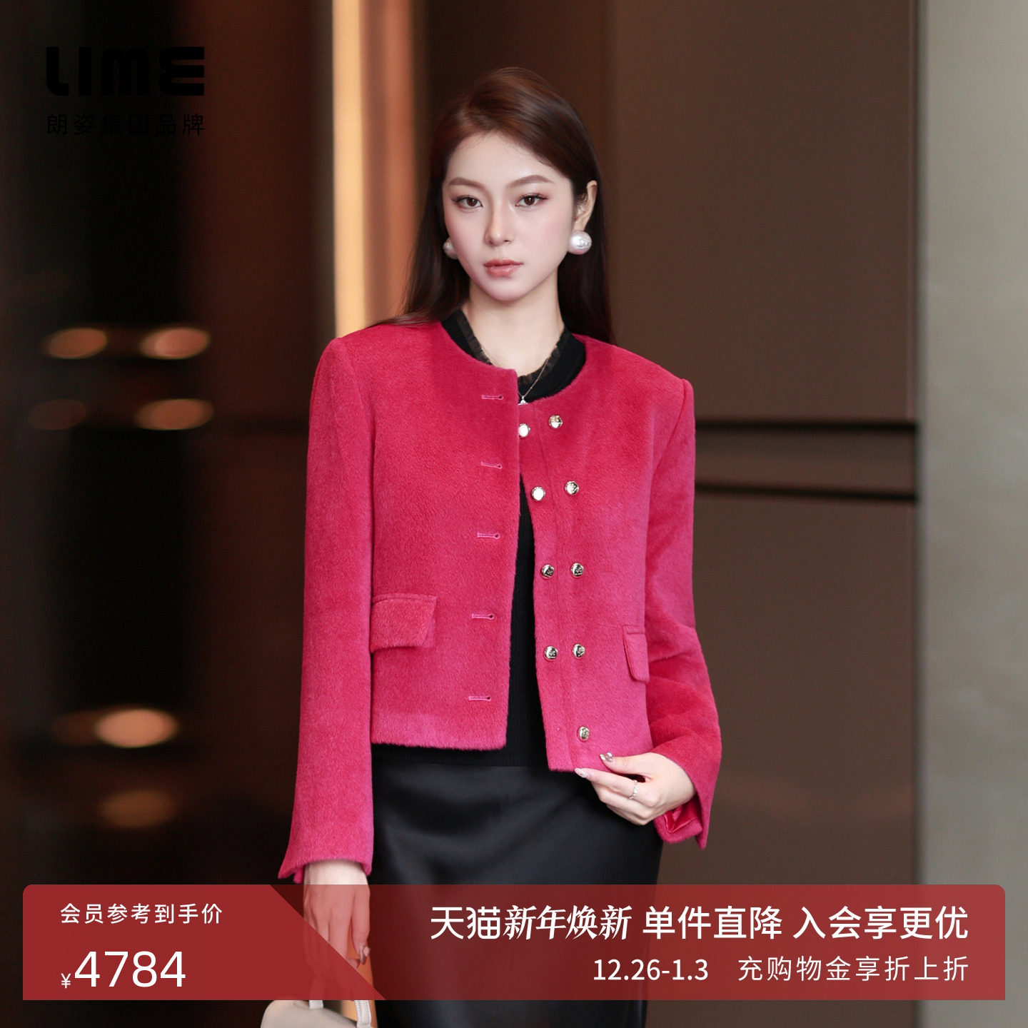 朗姿集团LIME莱茵羊驼毛短大衣孔雀粉红色气质简约小个子25冬新款