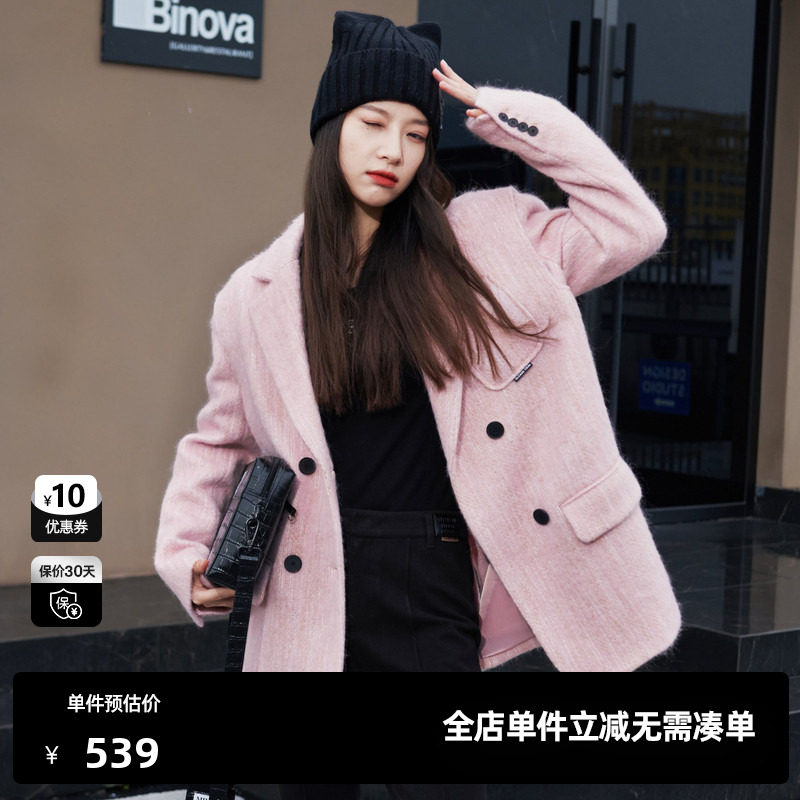 品牌折扣中长款粉红色羊毛呢大衣女欧美风西装领双排扣秋冬外套潮
