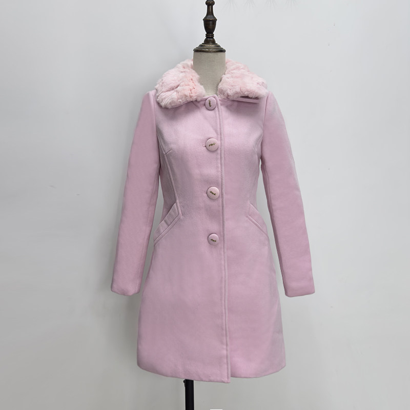 粉红色羊毛呢外套小个子中长款真兔毛领品牌折扣冬款毛呢大衣XS码