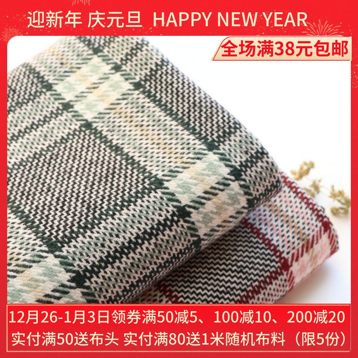 粉红灰绿色千鸟格子混纺粗花呢厚布料冬季大衣西装衣服装时装面料