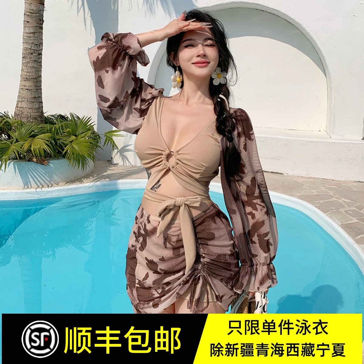 新款性感长袖防晒纯欲遮肉显瘦分体大码比基尼三件套温泉度假泳衣