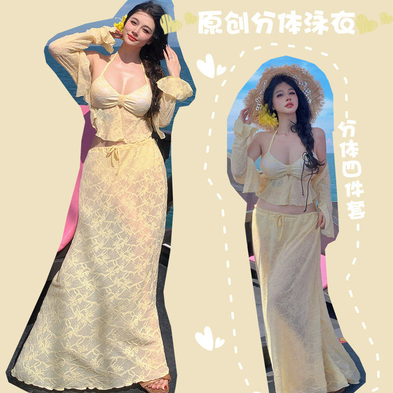 比基尼泳衣女微胖女孩大码绝美黄色分体三件套性感长裙海岛度假风