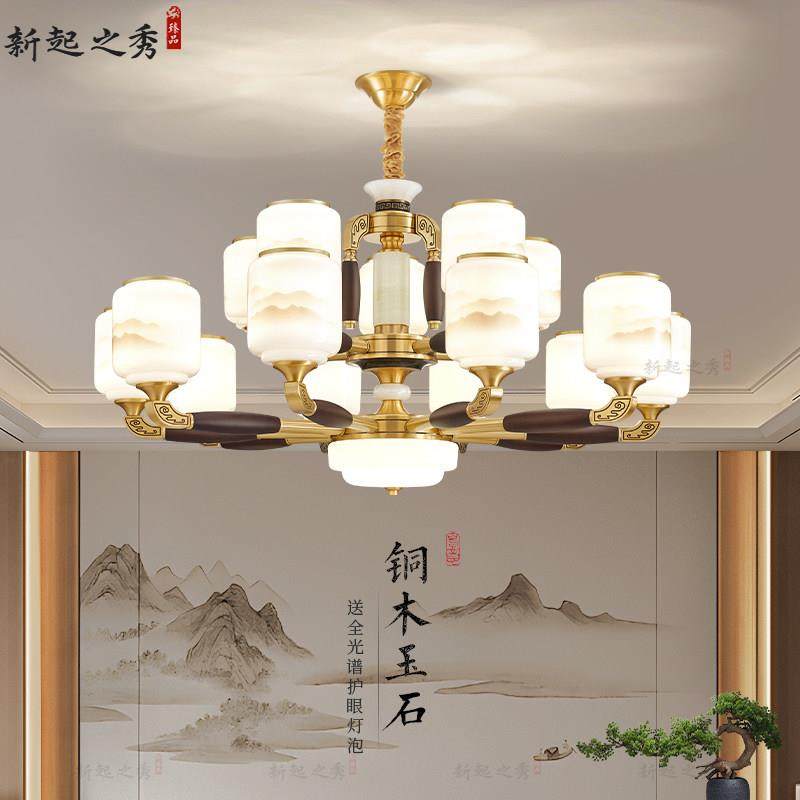 新中式全铜玉石客厅吊灯2024年新款复式楼别墅餐厅大气中山灯具