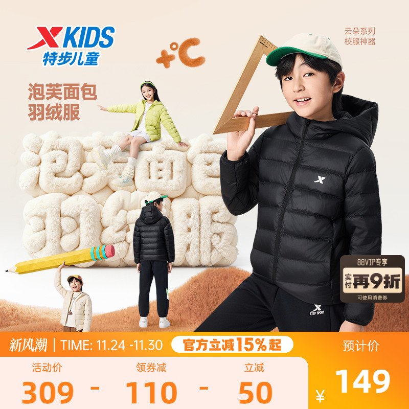 特步童装儿童轻薄款羽绒服男童外套2025年秋冬新款大童防寒服冬装