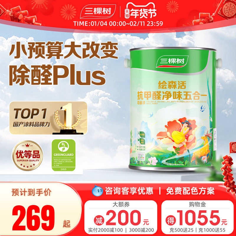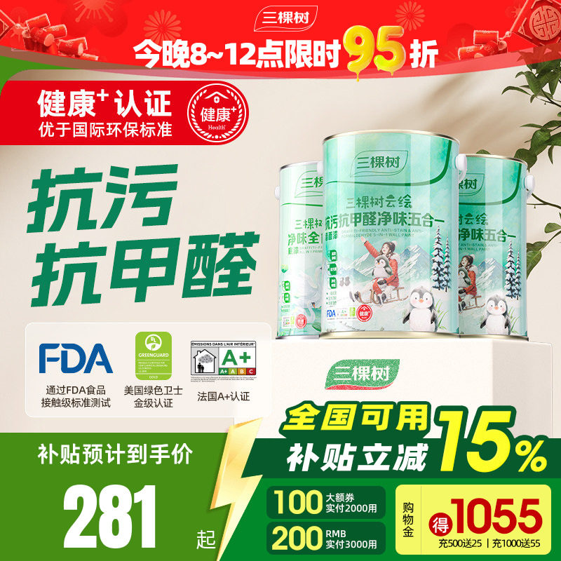 三棵树乳胶漆抗甲醛内墙漆室内家用新房翻新墙面漆油漆涂料白墙漆