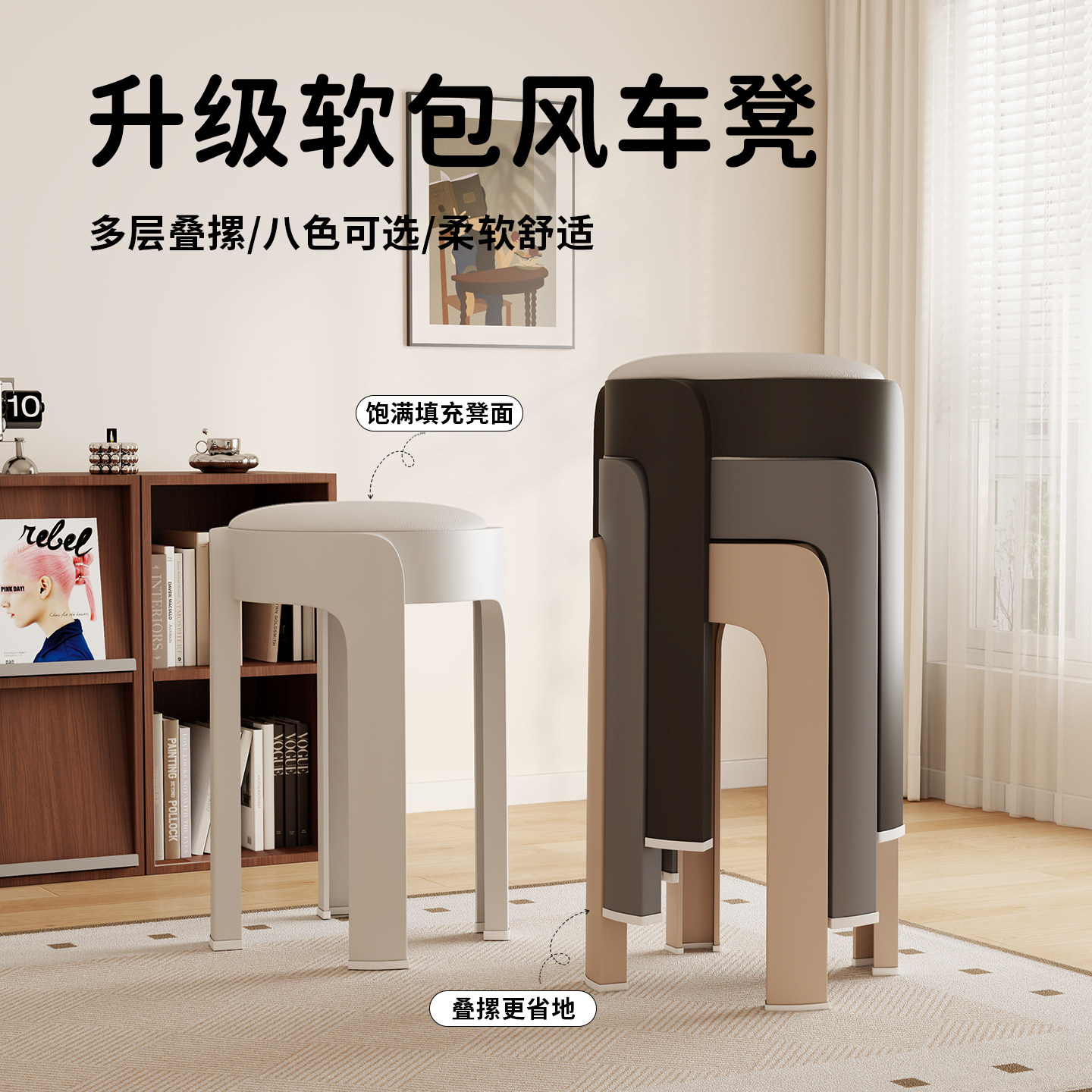 日本叠放软包凳子家用加厚结实塑料高圆凳轻奢高级感客厅餐桌椅子