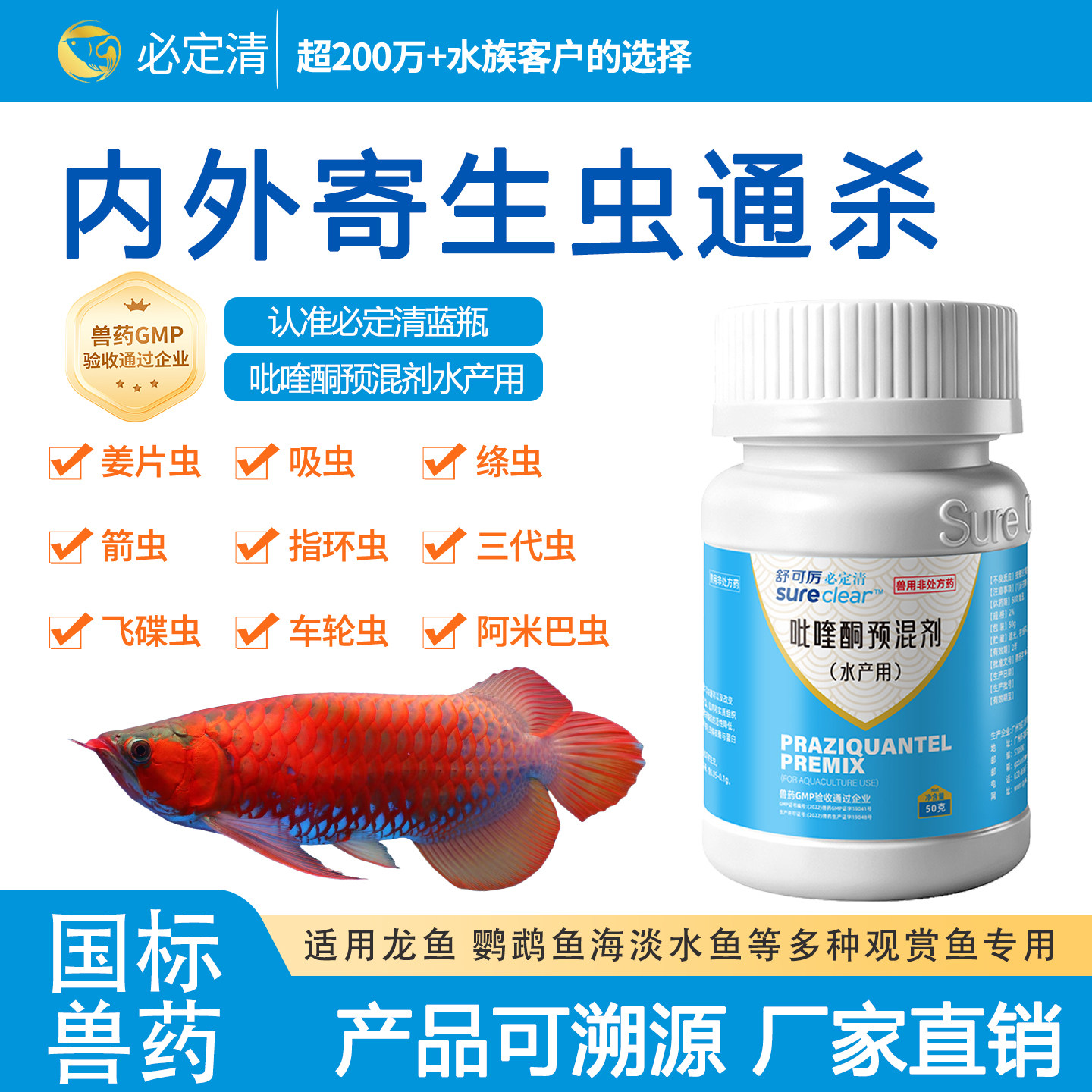 新必定清鱼药吡喹酮龙鱼鹦鹉鱼内外寄生虫驱虫药双杀绦虫观赏鱼用
