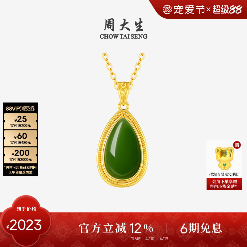周大生黄金项链镶和田玉吊坠女款水滴福禄葫芦挂坠生日礼物送妈妈