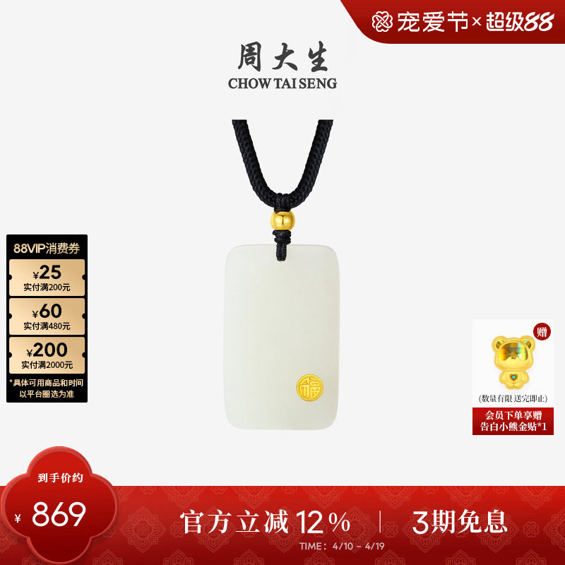 周大生黄金平安无事牌和田玉吊坠男女款玉坠牌项链生日礼物送男友