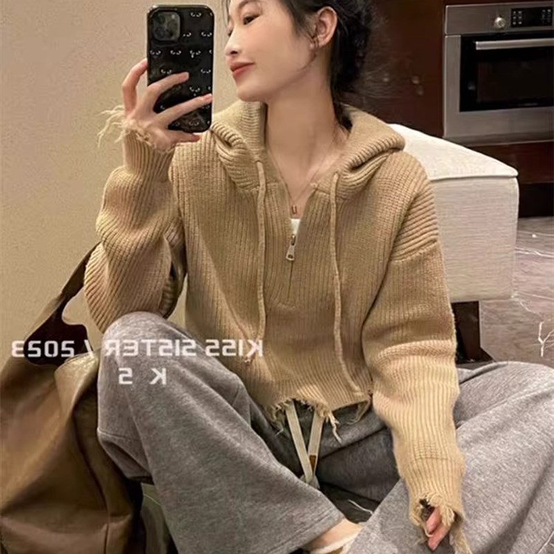 设计感破边流苏毛衣女秋冬新款韩版宽松连帽拉链套头短Y款针织上
