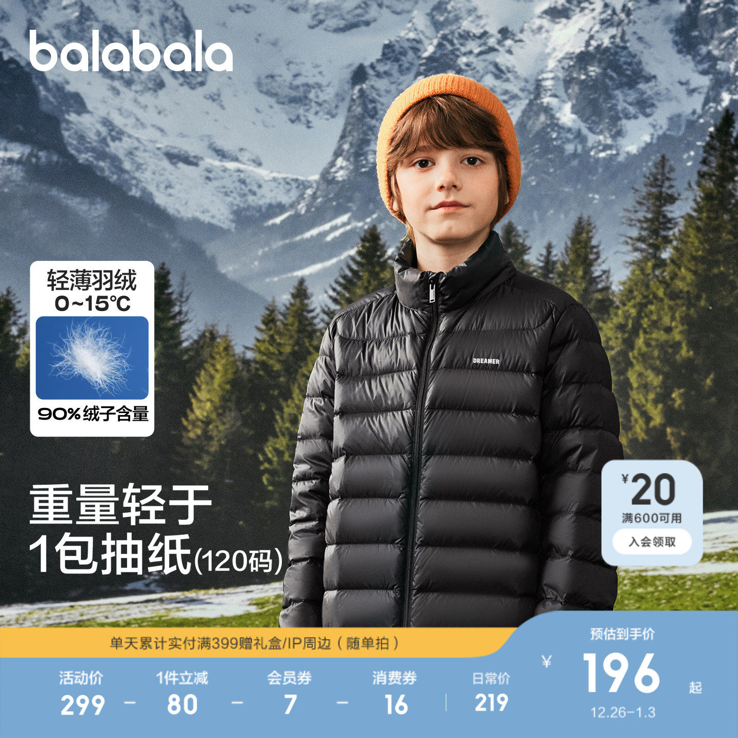巴拉巴拉儿童轻薄羽绒服男女童冬装内胆三防保暖外套舒适户外上衣