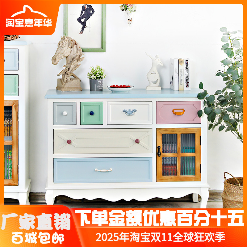 美式五斗柜地中海卧室实木储物收纳柜茶几电视柜组合彩绘客厅柜子