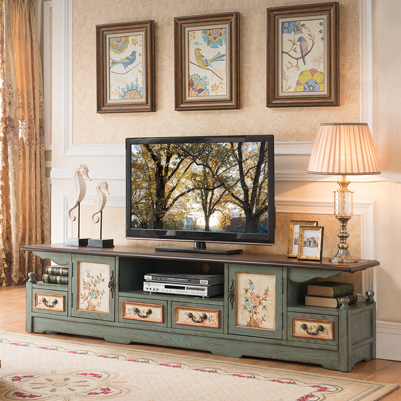地中海田园彩绘创意视听柜子客厅地柜美式乡村实木电视柜茶几组合