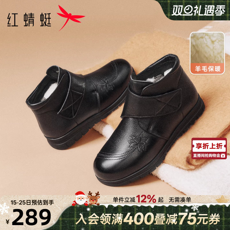 红蜻蜓妈妈鞋2025冬季新女士皮鞋保暖鞋子老年人防滑真皮女鞋靴子