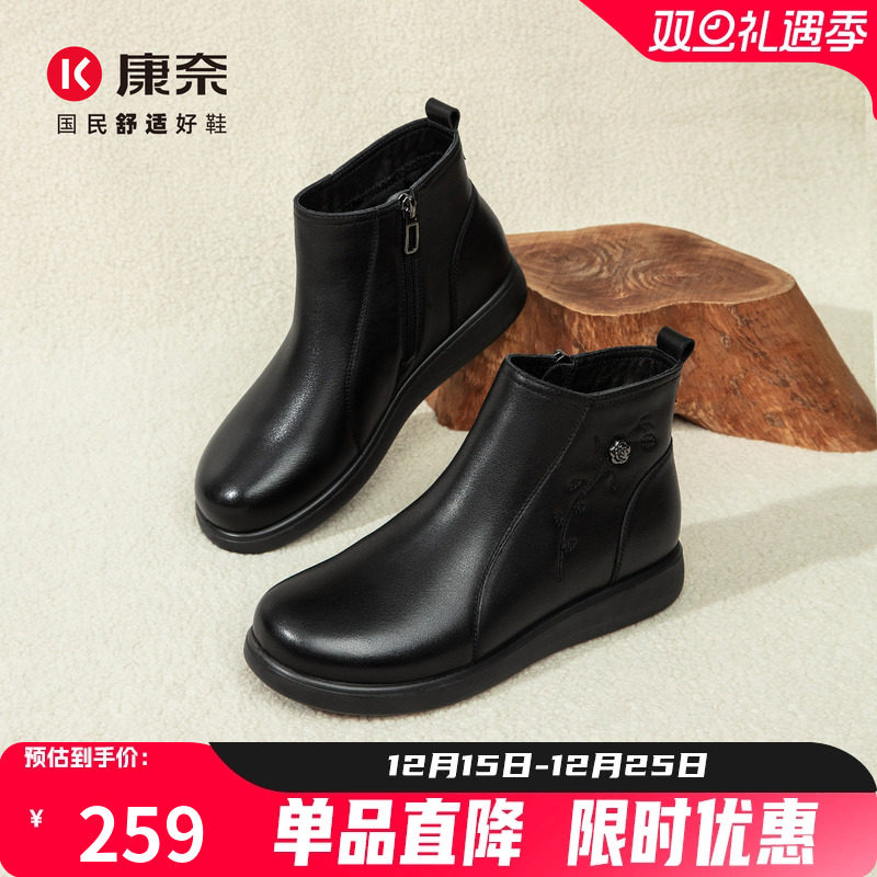 康奈女鞋冬季真皮短靴平底轻软底舒适加绒保暖棉靴中老年人妈妈鞋