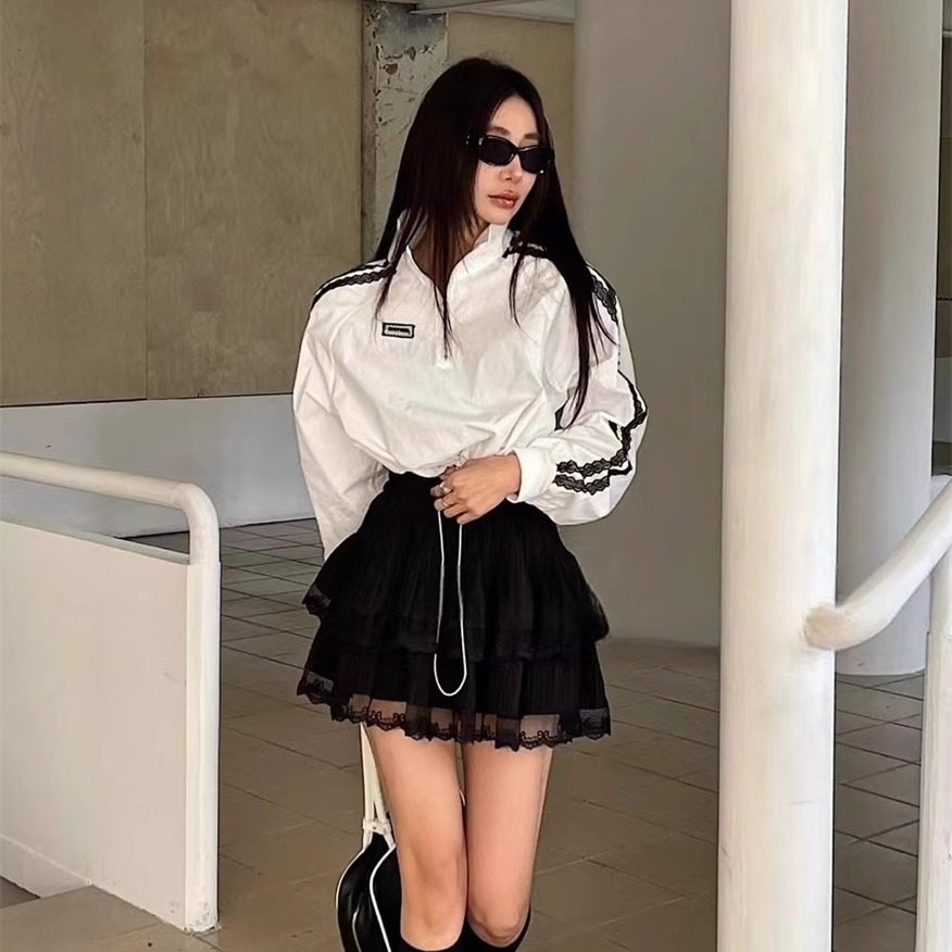小个子高腰白色蕾丝花边A字半身裙套装蓬蓬蛋糕短裙配外套两件套