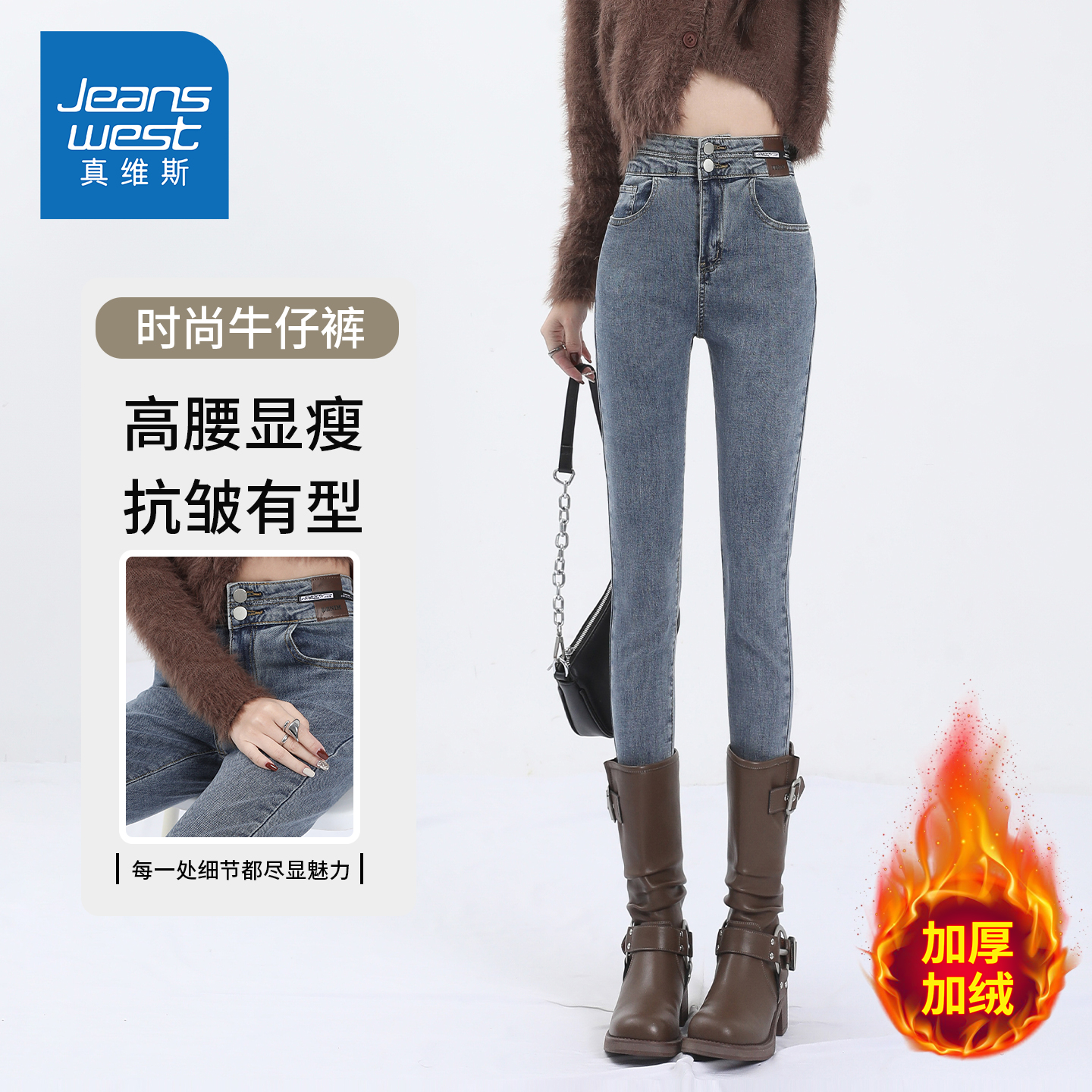 KZH真维斯加绒牛仔裤女秋冬新款修身显瘦小脚裤高腰加厚铅笔长裤