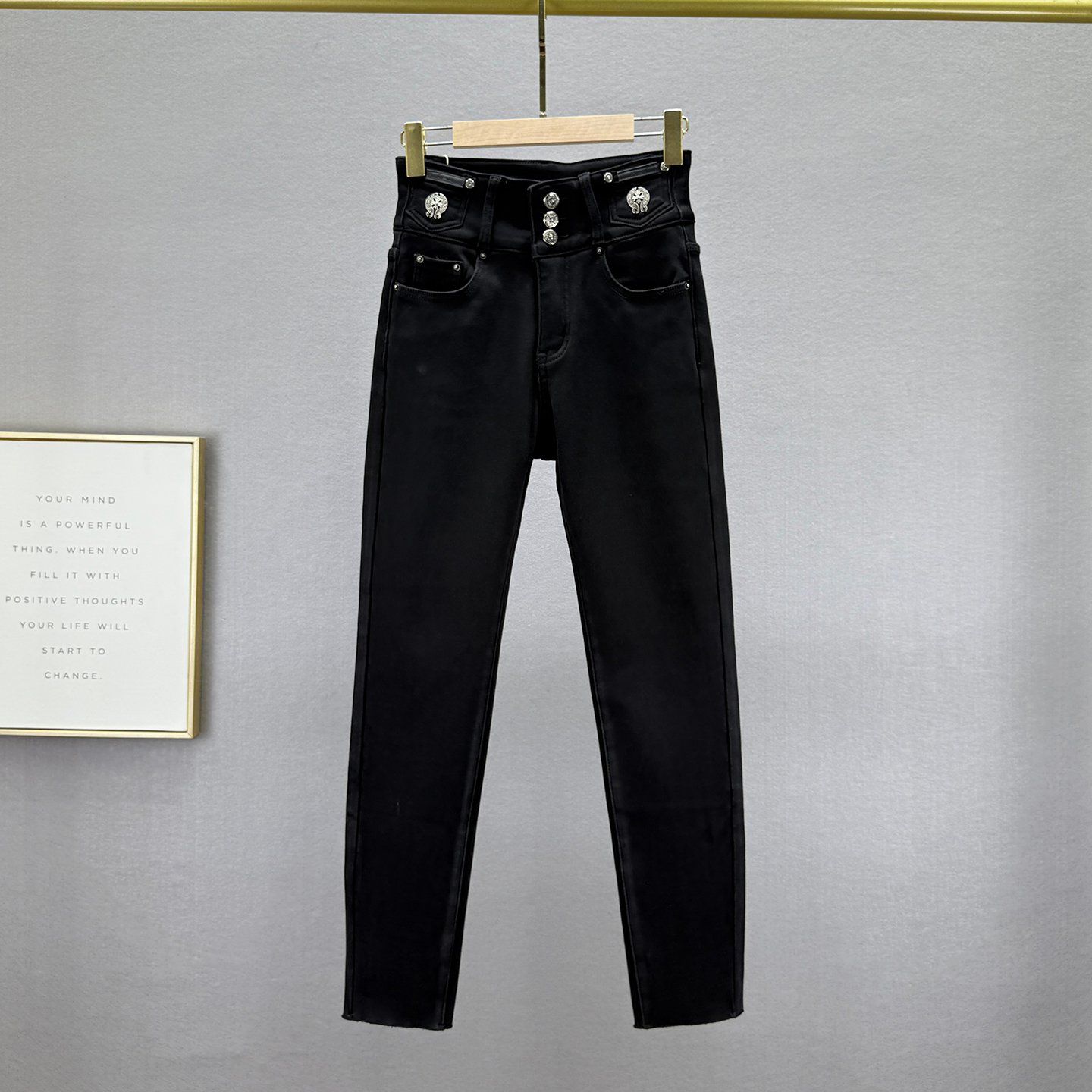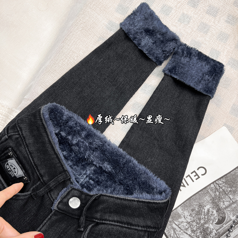 加绒加厚牛仔裤女长裤2025年冬季新款高腰修身显瘦黑色小脚铅笔裤