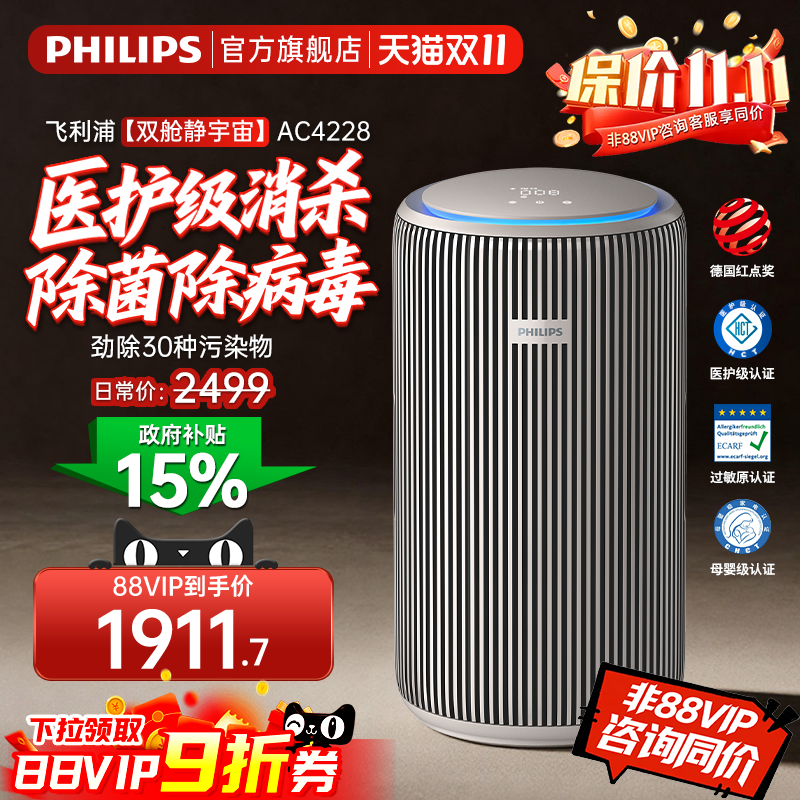 飞利浦空气净化器家用宠物除甲醛二手烟吸猫毛除异味净化机AC4228