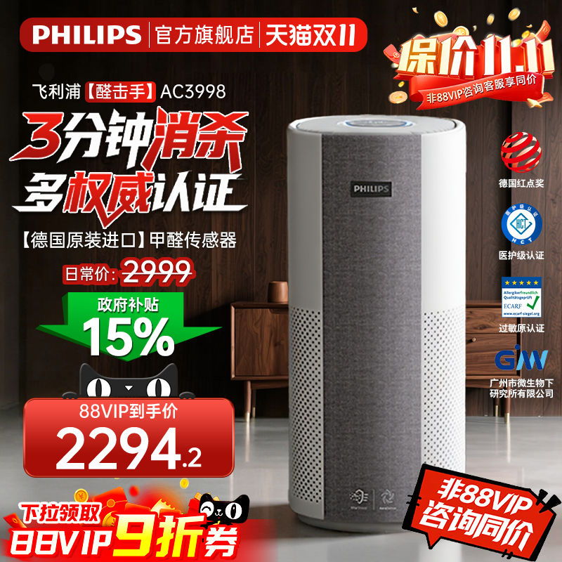 飞利浦空气净化器家用除甲醛除雾霾去二手烟消毒卧室净化机AC3998