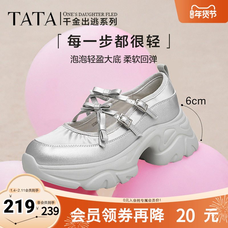 Tata他她厚底银色玛丽珍鞋女鞋休闲运动单鞋2025秋新CGB01CQ4奥莱