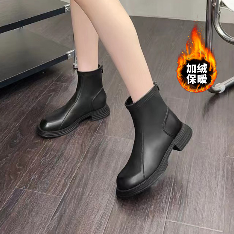 嘉俪多英伦短靴女圆头平跟低冬季薄绒后拉链保暖休闲时尚气质新款