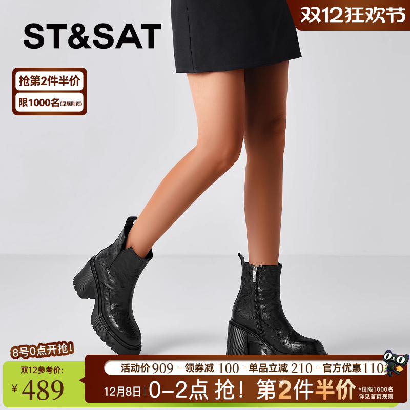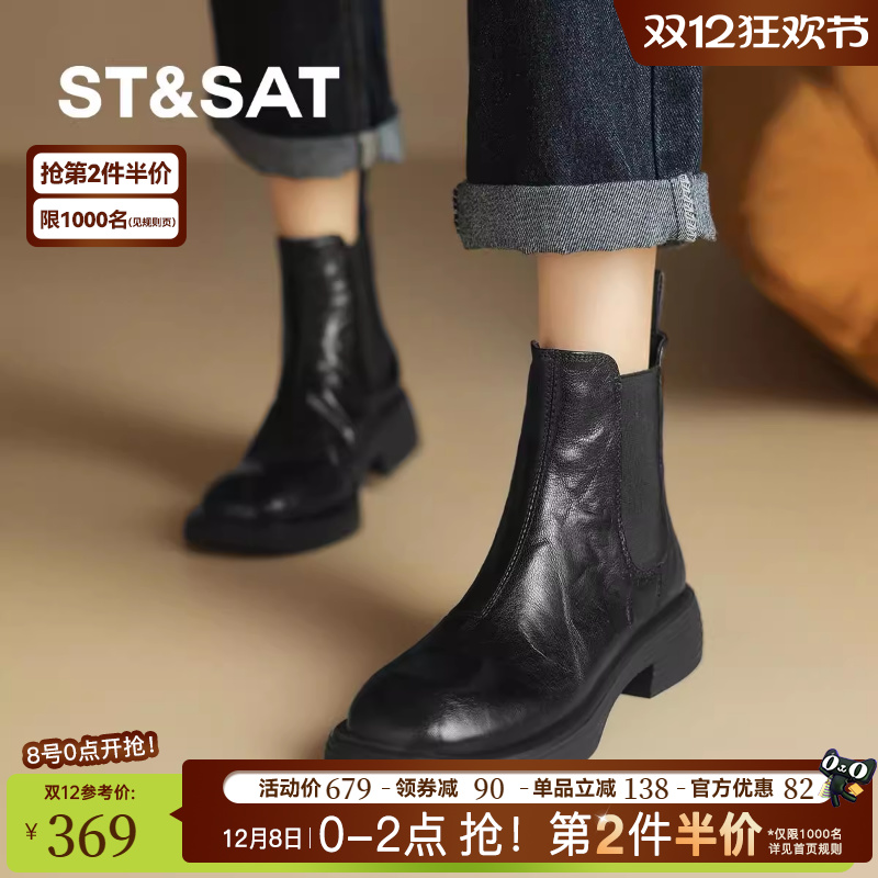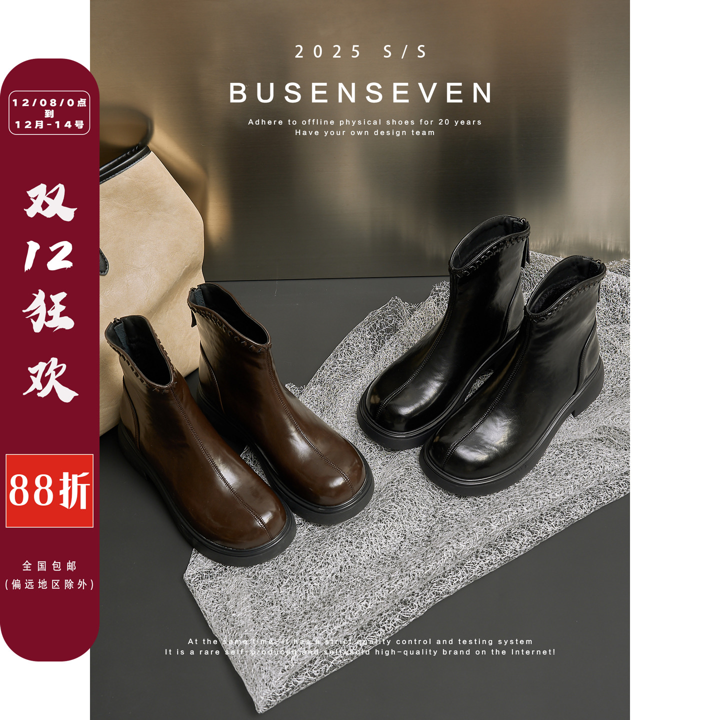 星期六真皮短靴女2025秋冬圆头粗跟烟筒靴厚底英伦百搭小个子女靴