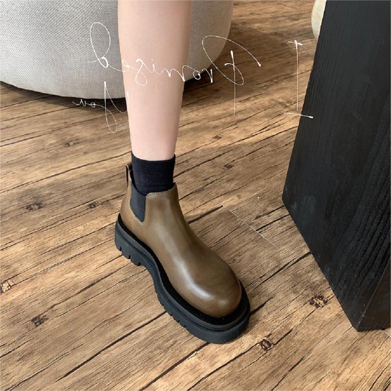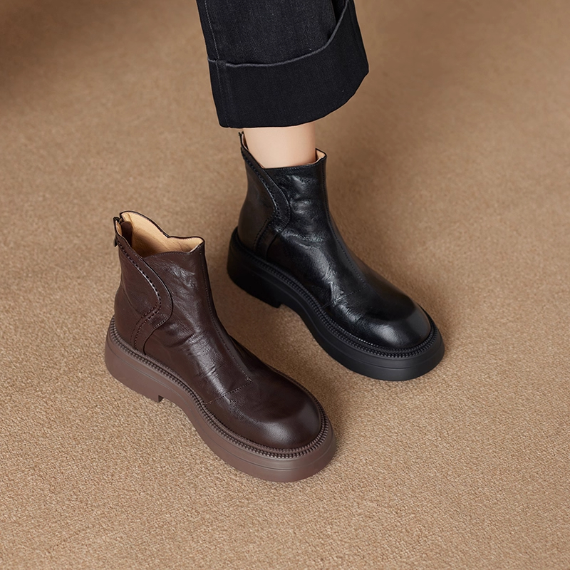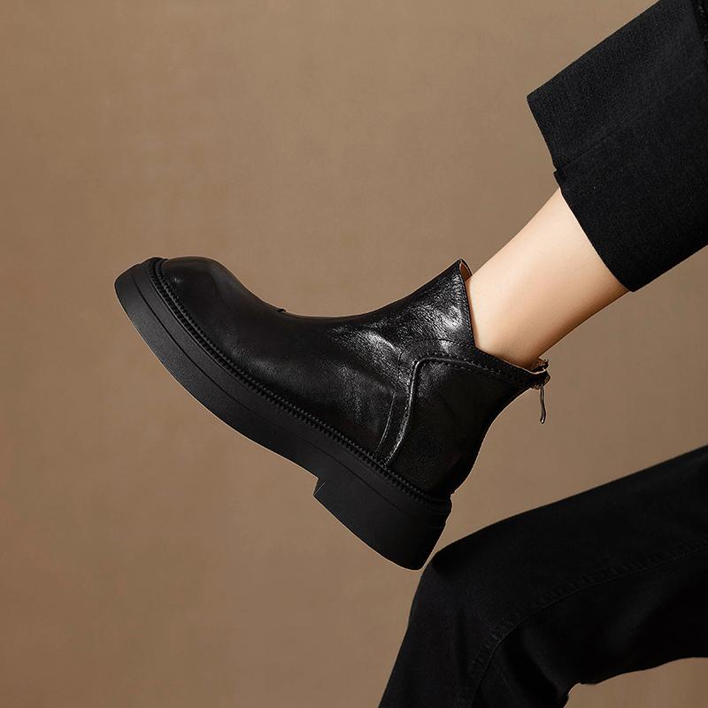 通勤英伦风真皮圆头后拉链马丁靴女百搭复古厚底短靴羊皮切尔西靴