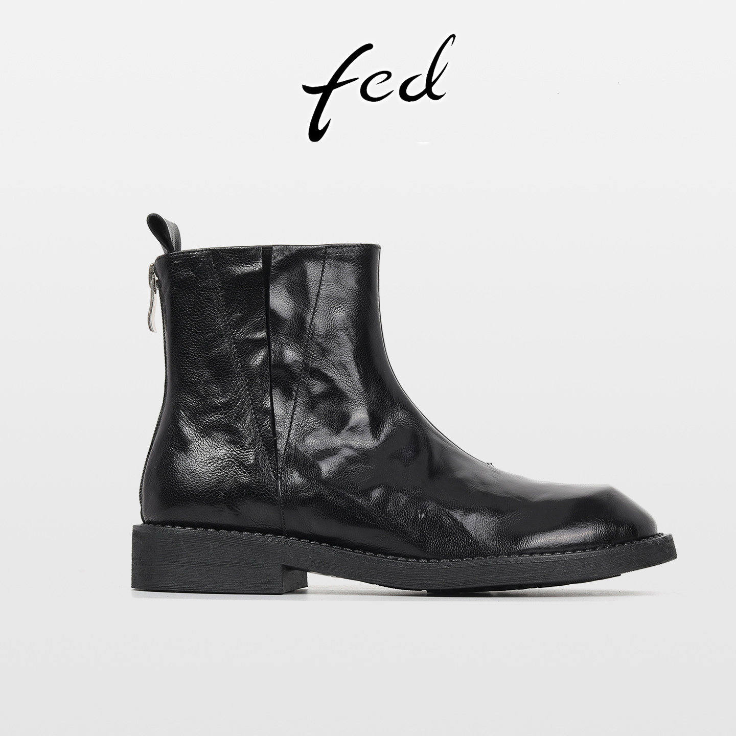 fed英伦风复古真皮粗跟马丁靴女秋冬款后拉链中跟圆头切尔西短靴