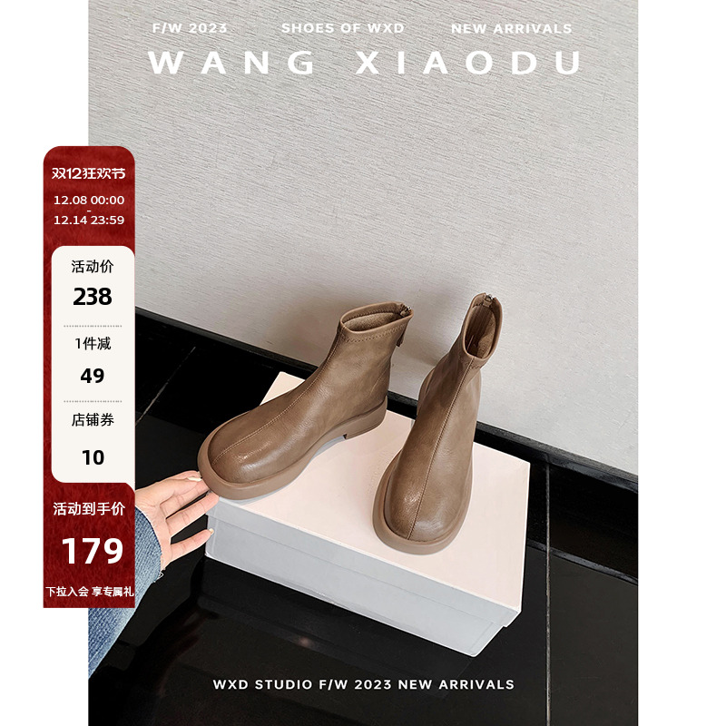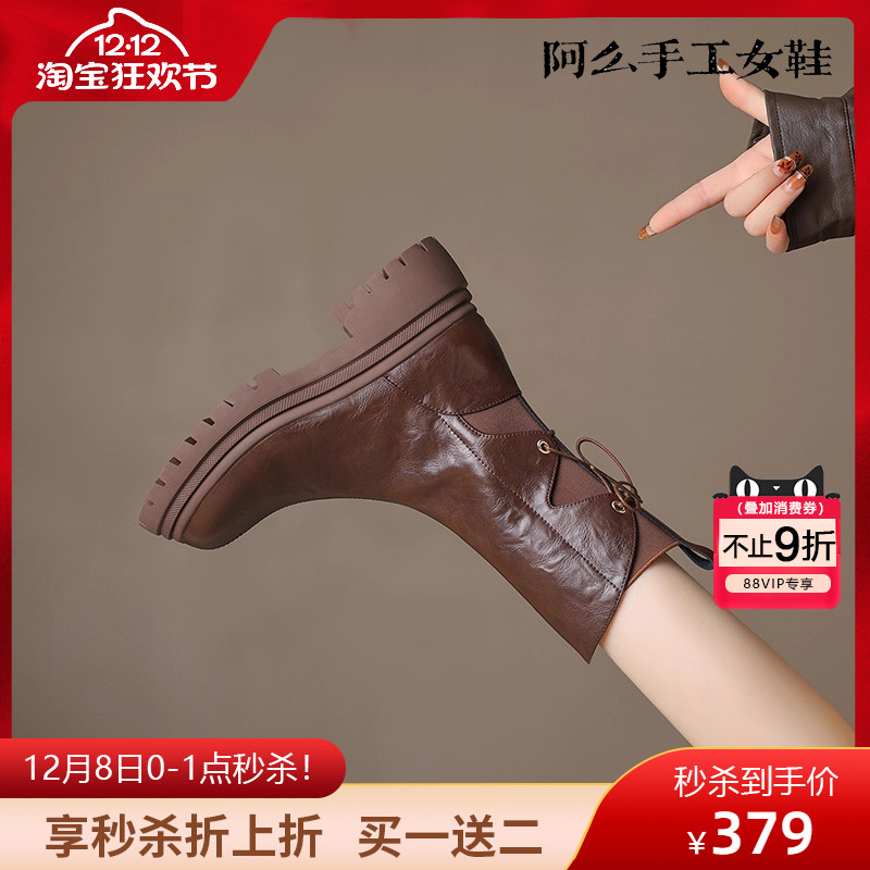 阿么手工女鞋真皮中筒靴时装靴秋冬新款厚底皮鞋圆头英伦风短靴女