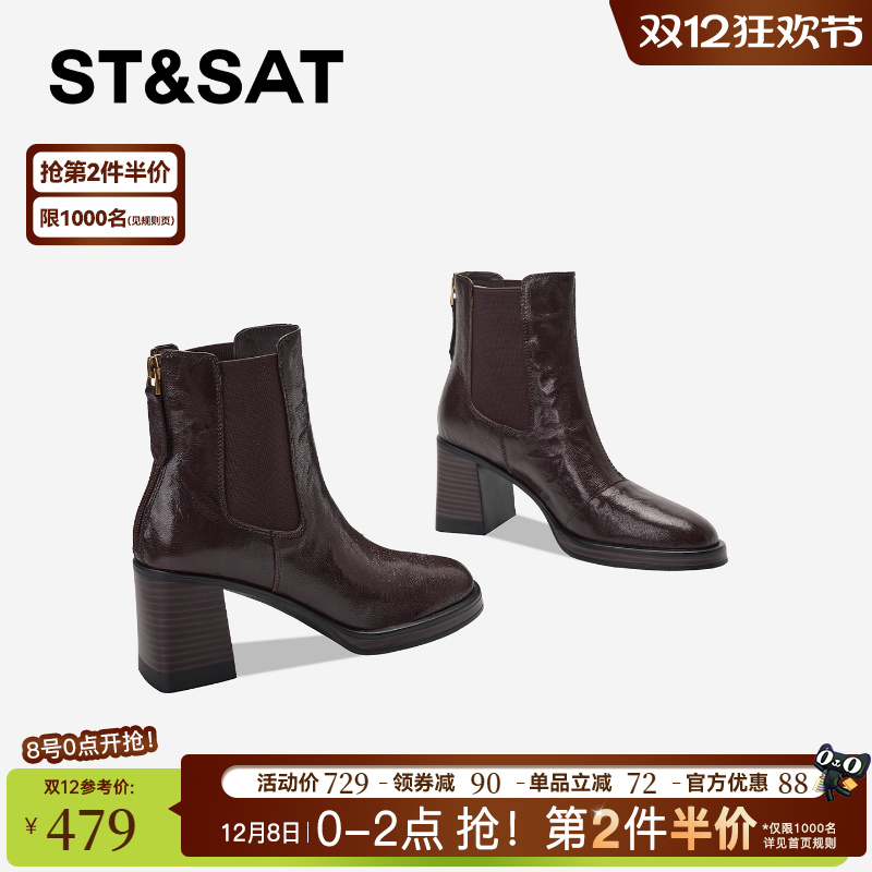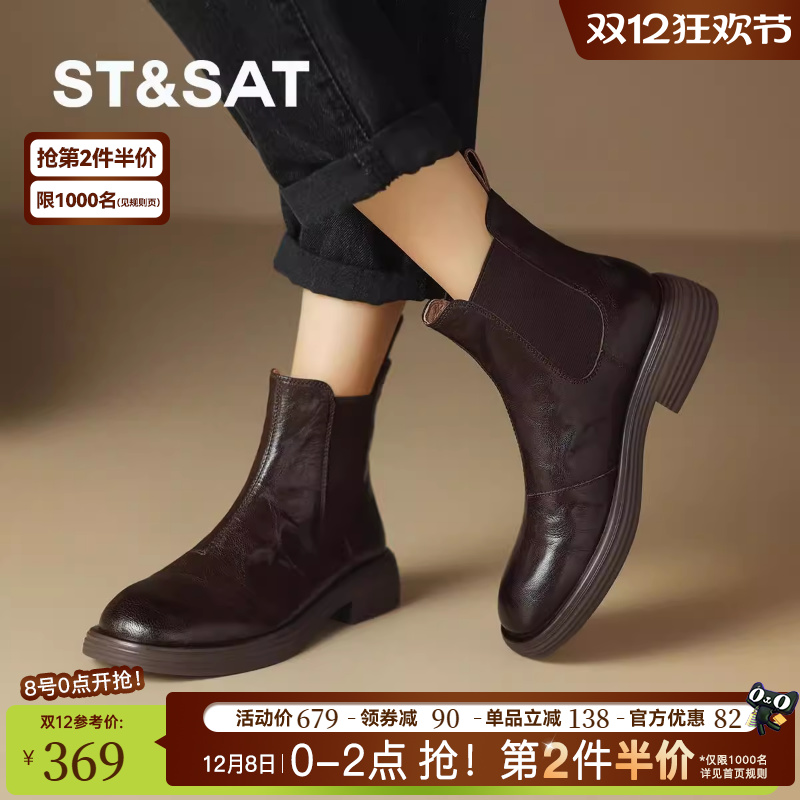 星期六英伦风切尔西靴秋冬季圆头粗跟短靴高跟女SS24116434