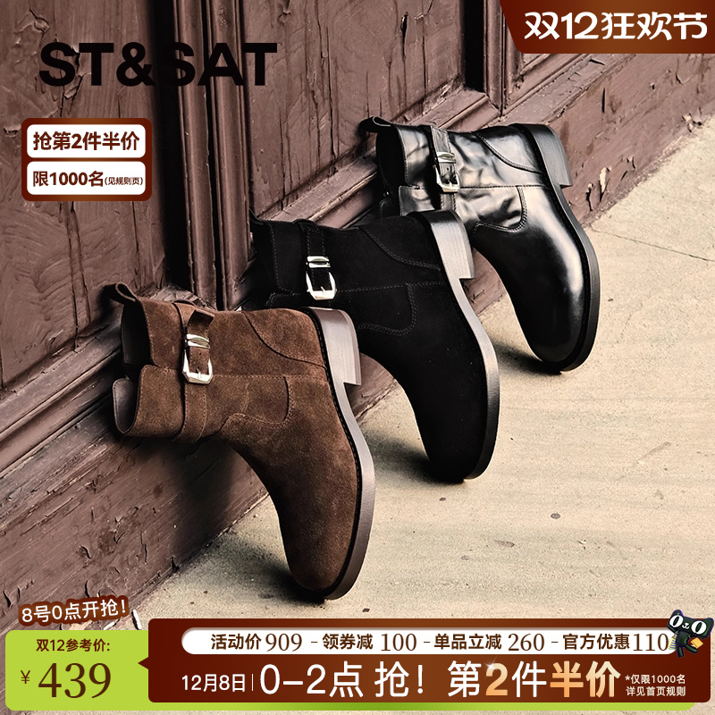 星期六秋冬新款英伦风侧拉链边扣圆头筒靴方跟百搭款女短靴6B1K