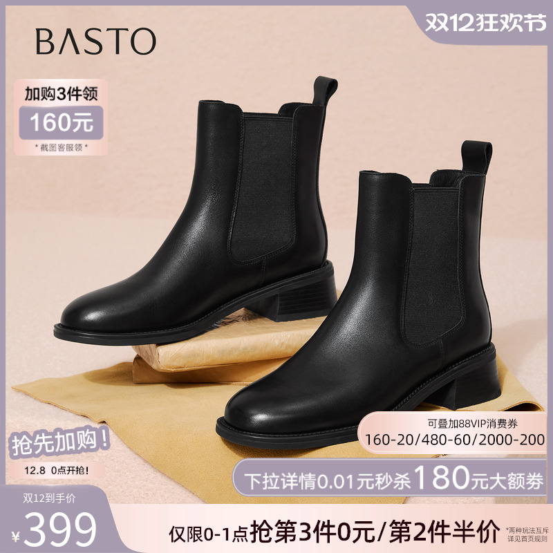 百思图2025冬季新款牛皮英伦切尔西靴通勤圆头粗跟女短靴W0801DD5