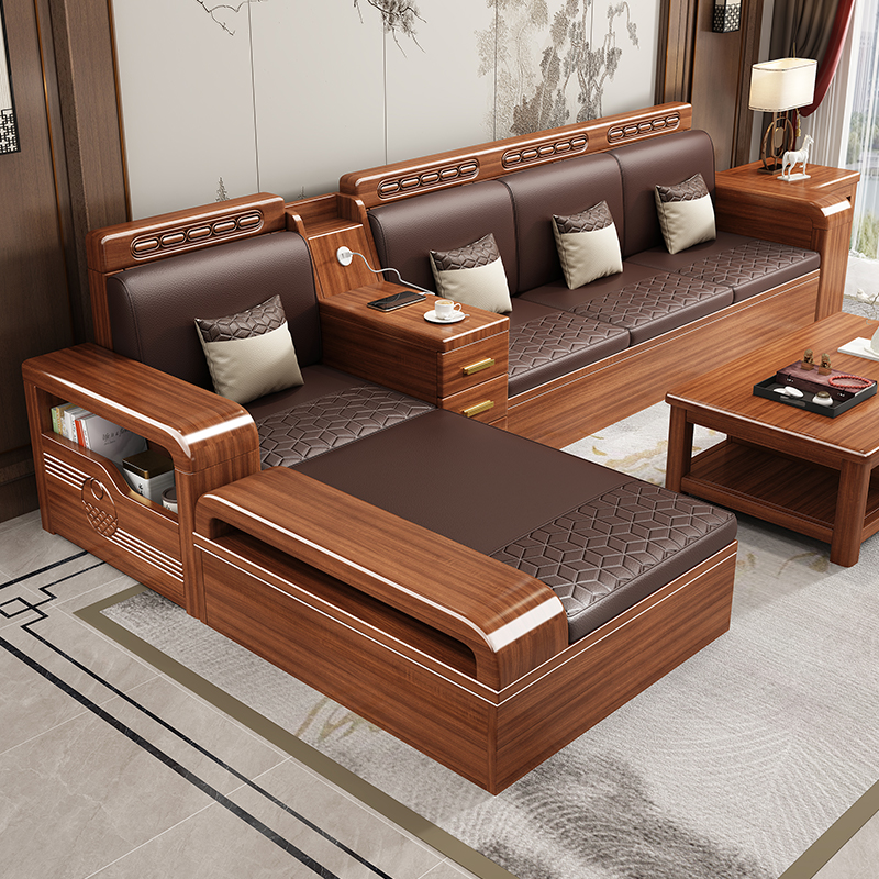 新中式胡桃木实木沙发组合冬夏两用现代大小户型客厅转角储物沙发