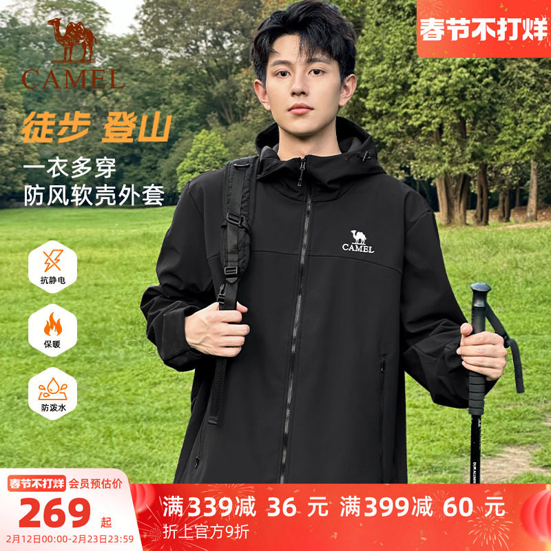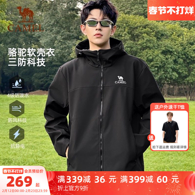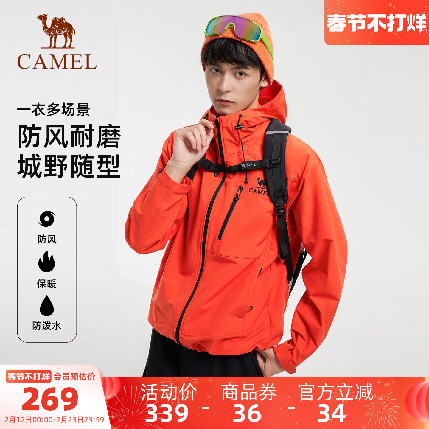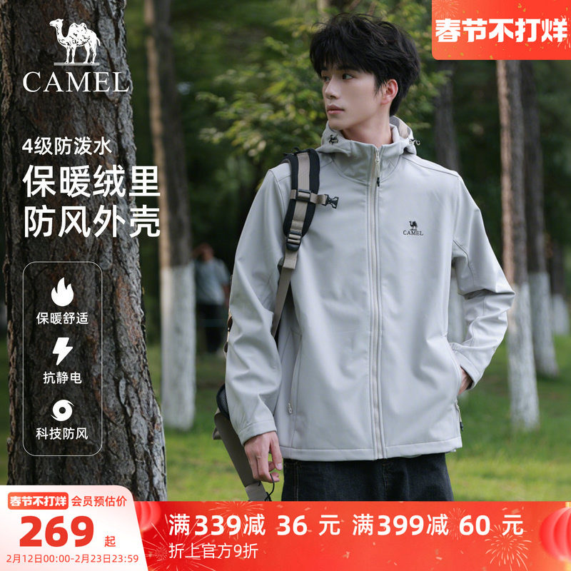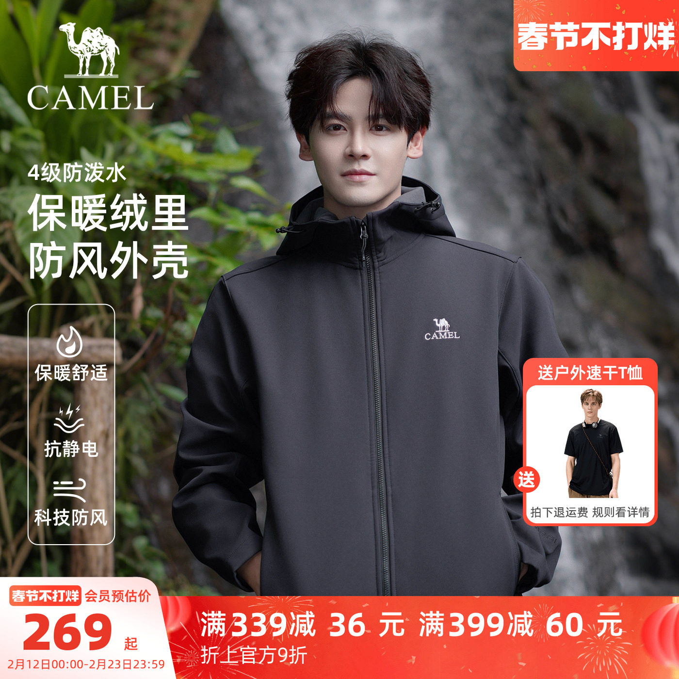 骆驼户外冲锋软壳衣外套男25秋冬加绒连帽夹克防风防水徒步登山服