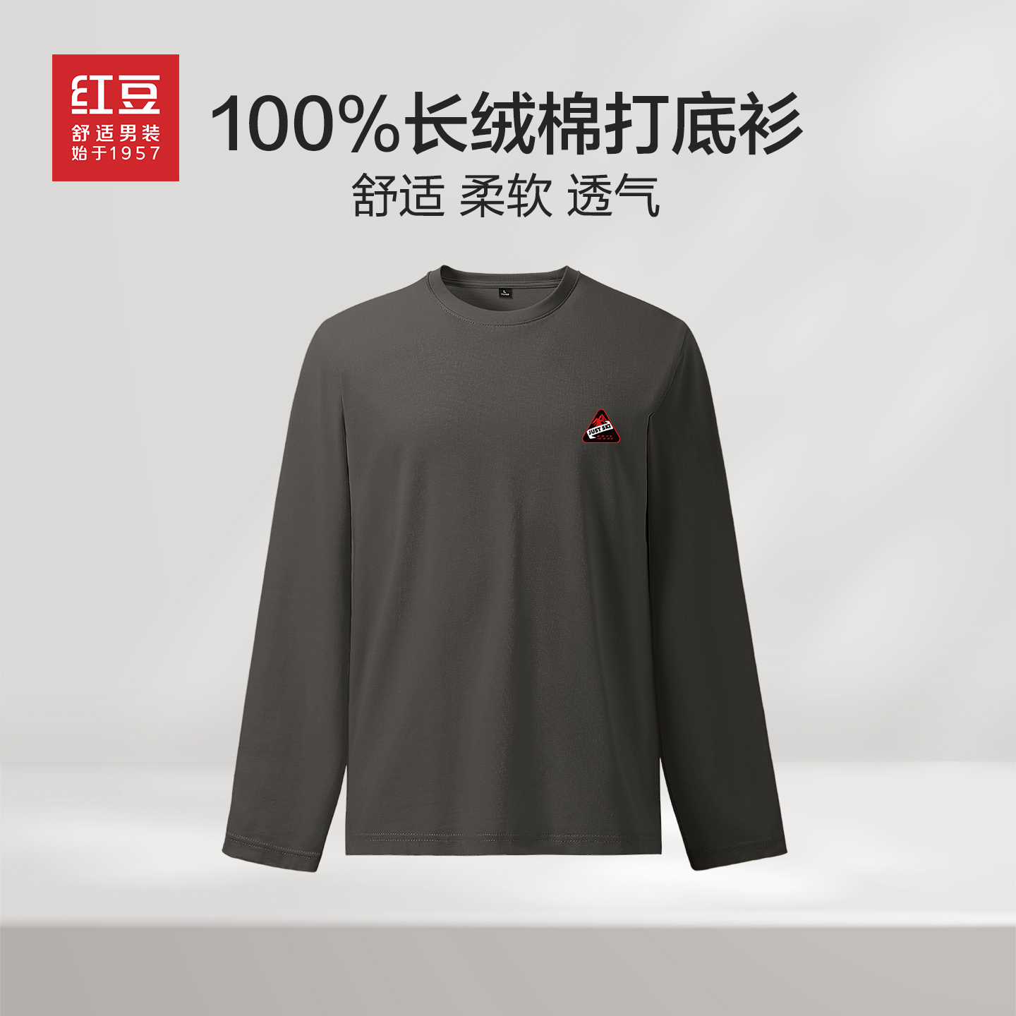 红豆长绒棉长袖圆领T恤男春秋款纯棉宽松内搭灰色大码打底衫PC