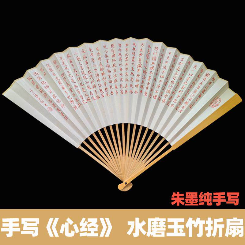 手写心经扇子朱墨色毛笔字小楷书法古典文玩宣纸扇面定制玉竹折扇