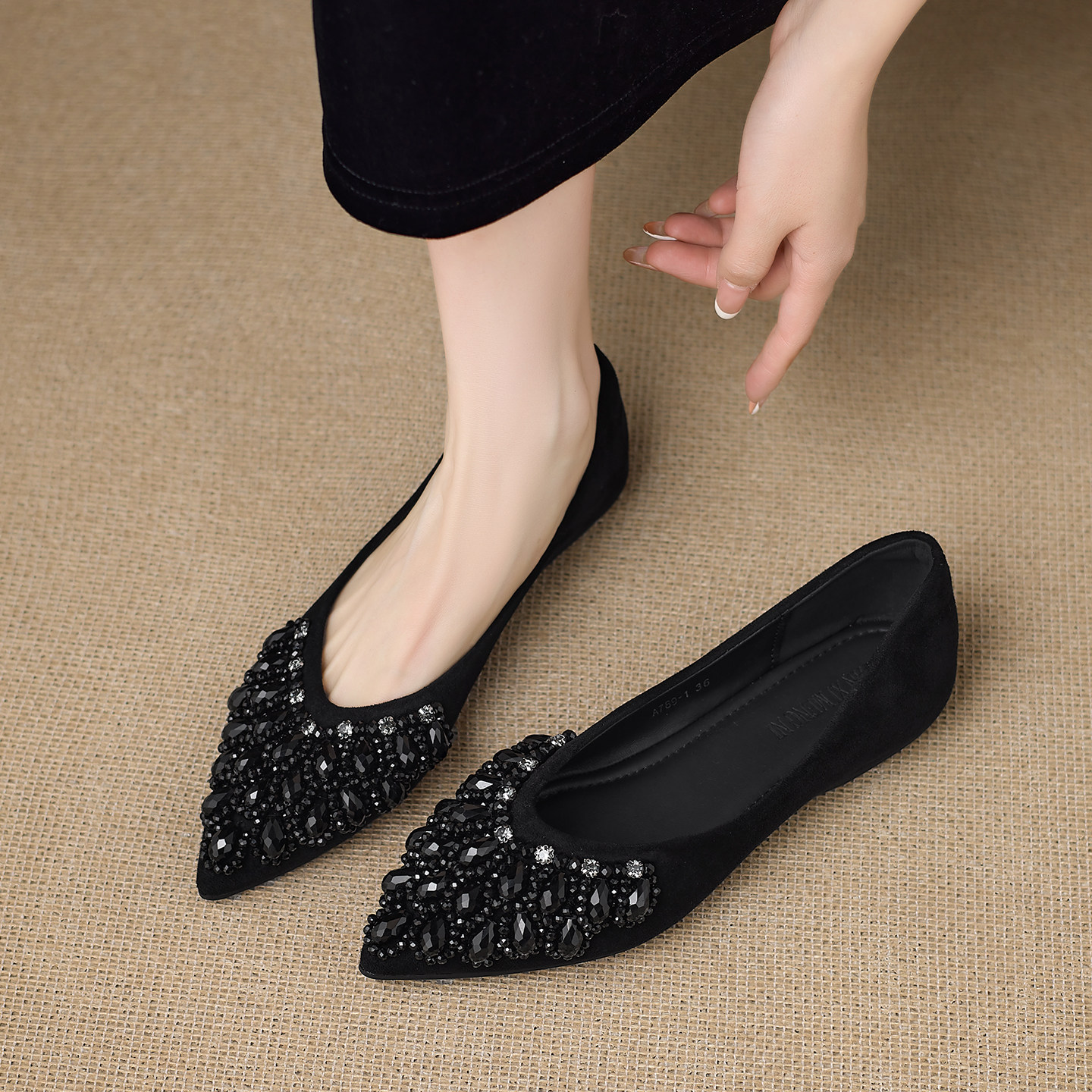 真皮单鞋女2025春夏新款伴娘鞋气质水钻尖头浅口软底平底大码瓢鞋